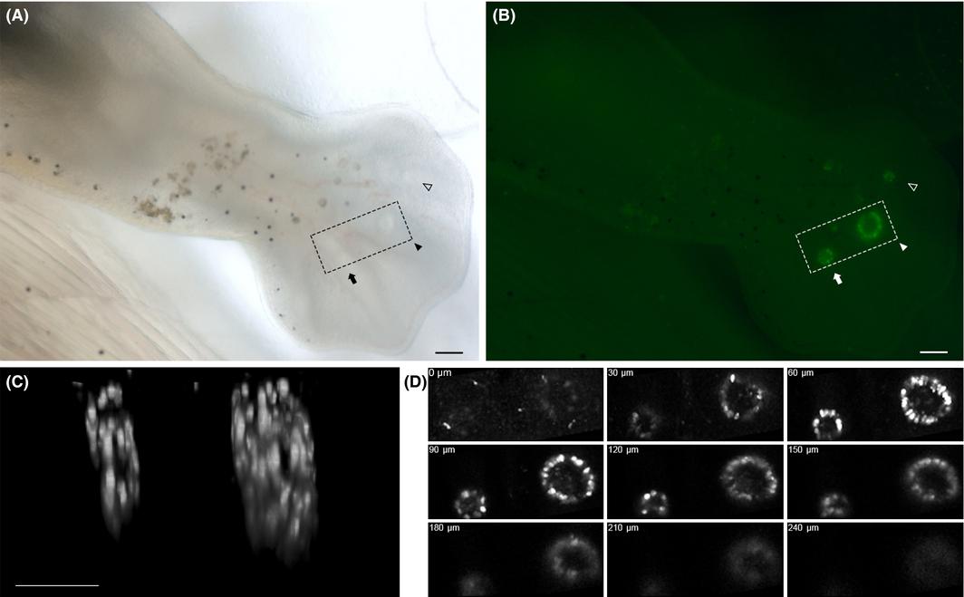 3D imaging of a gene product induced by Infrared laser irradiation (IR-LEGO). (A) A bright field image of a lefthindlimb bud of a Dkk1GFP F2 Tg X. laevis tadpole at stage 55. This tadpole was irradiated and then photographed from the dorsal side. Irradiation was done with 20à objective lens at 60 mW for 1.0 s (arrow), 80 mW for 1.0 s (arrowhead) and 50 mW for for 1.0 s (open arrowhead). (B) A fluorescent (GFP) image of the same sample as that shown in (A). (C) Image stacks of 334 μm by 144 μm by 90 μm (xyz) were acquired from the dashed square in (A) and (B) and then converted into 3D images with ImageJ 3D Viewer. (A)â(C) Pictures were taken 18 h after irradiation. (D) Representative images from image stacks acquired in (C). The numbers in the upper left corner indicate the depth from the dorsal surface of the hindlimb bud. Scale bar = 100 μm.