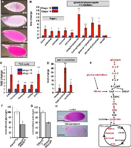 Figure 1. A Shift in Glycolysis and Gluconeogenesis Drives Glycogen Accumulation in Oocytes(A) Periodic acid Schiff’s staining of glycogen in Drosophila follicles. Scale bar, 50 μm.(B) GC/MS measurements of select glycolytic intermediates and sugars from stage 10 and stage 14 follicles.(C) GC/MS measurements of TCA cycle intermediates from stage 10 and stage 14 follicles.(D) GC/MS measurements of the byproducts of purine breakdown from stage 10 and stage 14 follicles.(E) Model of both the glycolysis and TCA pathways. Highlighted in red are the compounds that increased at least 3-fold in stage 14 oocytes.(F) Colorimetric glycogen measurements of stage 14 oocytes from pepckGS/pepckGS mutant females.(G) Colorimetric glycogen measurements of stage 14 oocytes from DNaseIIlo/DNaseIIlo mutant females.(H) PAS staining of oocytes from DNaseIIlo/DNaseIIlo mutant females.Error bars represent SD. ∗p < 0.05; ∗∗p < 0.005. |