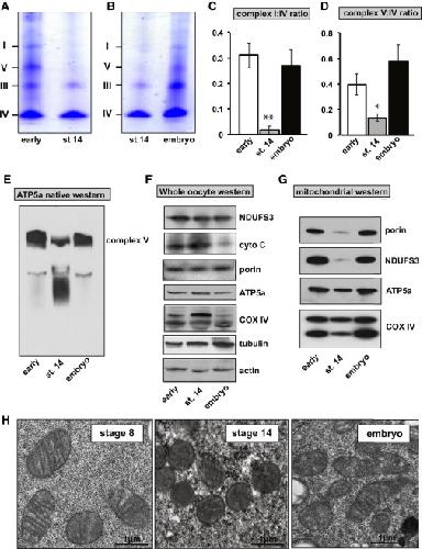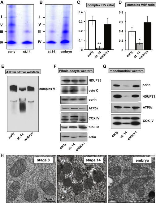 Figure 3. ETC Remodeling Drives Mitochondrial Respiratory Quiescence(A) Blue native PAGE of mitochondria from early-stage follicles and stage 14 oocytes.(B) Blue native PAGE of isolated mitochondria from stage 14 oocytes and 12- to 16-hr embryos.(C) Quantification of the ratio of complex I to complex IV from early follicles, stage 14 oocytes, and 12- to 16-hr embryos.(D) Quantification of the ratio of complex V to complex IV from early follicles, stage 14 oocytes, and 12-16 hr embryos.(E) Native western blot of ATP5a from early-stage follicles, stage 14 oocytes, and 12- to 16-hr embryos.(F) Whole-oocyte western blots of select mitochondrial proteins: ATP5a, NDUF3, COX IV, CYTOCHROME C, PORIN, and the loading controls ACTIN and TUBULIN from early-stage follicles, stage 14 oocytes, and 12- to 16-hr embryo samples.(G) Western blots of isolated mitochondria from early-stage follicles, stage 14 oocytes, and 12- to 16-hr embryo samples.(H) Electron microscope images of mitochondria from stage 8, stage 14 oocytes, and embryos.Error bars represent SD. âp < 0.05; ââp < 0.005. |