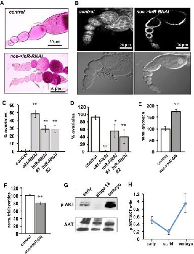 Figure 4. Insulin Regulates the Timing of Glycogen Accumulation and Mitochondrial Depolarization(A) Periodic acid Schiffâs staining (glycogen) of nos-GAL4/+ control and nos->InR-RNAi ovarioles.(B) TMRE staining and DIC images (below) of nos-GAL4/+ control and nos->InR-RNAi ovarioles.(C) Depicts the percentage of ovarioles that display premature glycogen accumulation from nos-GAL4/+ control, nosâAkt-RNA, nosâInR-RNA#1, and nosâInR-RNA#2 females.(D) Depicts the percentage of ovarioles that display a high level of mitochondrial membrane potential from nos-GAL4/+ control, nosâAkt-RNA, nosâInR-RNA#1, and nosâInR-RNA#2 females.(E) Normalized glycogen levels measured by colorimetric assay from nos-GAL4/+ control and nosâInR-DN stage 14 oocytes.(F) Normalized triglyceride levels measured by colorimetric assay from nos-GAL4/+ control and nosâInR-DN stage 14 oocytes.(G) p-AKT and AKT westerns from early-stage follicles, stage 14 oocytes, and 12- to 16-hr embryo samples.(H) Quantification of p-AKT/AKT ratios from early-stage follicles, stage 14 oocytes, and embryos.Error bars represent SD. âp < 0.05; ââp < 0.005. |