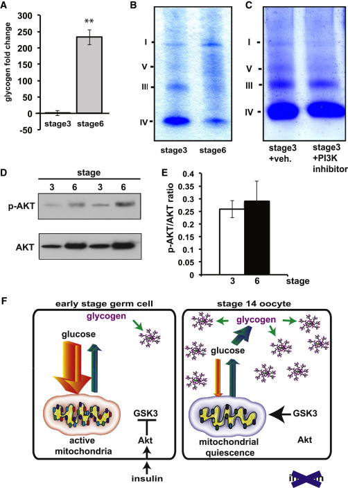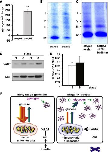 Figure 7. Insulin Regulation of ETC Remodeling Is Conserved in Vertebrate Oocytes(A) Total glycogen levels measured by colorimetric assay from stage 3 and stage 6 Xenopus oocytes. Data are expressed as fold change relative to stage 3 glycogen levels. Error bars represent 1à SD. âp < 0.05; ââp < 0.005.(B) Blue native PAGE of mitochondria from stage 3 and stage 6 Xenopus oocytes.(C) Blue native PAGE of mitochondria from vehicle-treated and 10 μM wortmannin (PI3K inhibitor)-treated stage 3 Xenopus oocytes.(D) Western blots assaying p-AKT and AKT levels in stage 3 and stage 6 Xenopus oocytes.(E) Quantification of the ratio of p-AKT/AKT calculated from western blots of stage 3 and stage 6 Xenopus oocytes.(F) Model of germline mitochondrial quiescence and glycogen accumulation. |