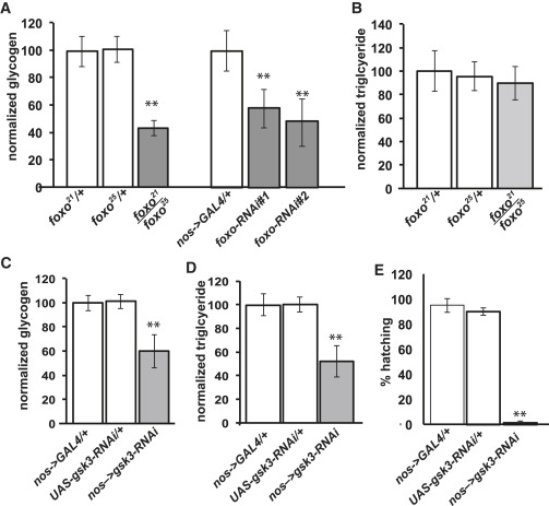 Figure 5. Akt Target Genes Are Required for Glycogen Storage in Stage 14 Oocytes(A) Glycogen levels were measured by colorimetric assay and normalized to total protein from the indicated genotypes. The results are displayed as a percentage of the wild-type control of each experiment.(B) Colorimetric triglyceride measurements of stage 14 oocytes from foxo21/foxo25 mutant females.(C and D) Glycogen (C) and triglyceride (D) levels were measured by colorimetric assay and normalized to total protein from nos-GAL4/+, UAS-gsk3-RNAi/+, and nosâgsk3-RNAi stage 14 oocytes.(E) Percent hatching of embryos from nos-GAL4/+, UAS-gsk3-RNAi/+, and nosâgsk3-RNAi stage 14 females.Error bars represent 1à SD. âp < 0.05; ââp < 0.005. |