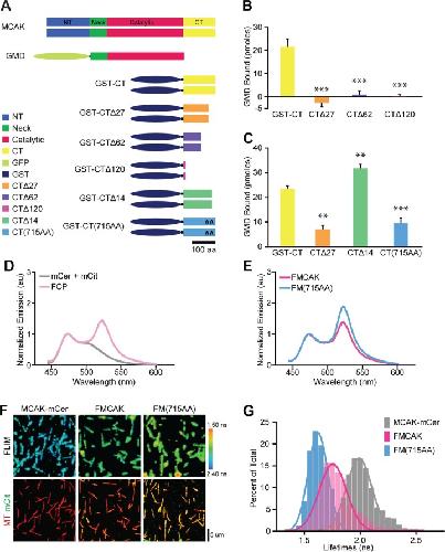 FIGURE 1:. The far C-terminus of MCAK is important for MCAK conformation. (A) Schematic of MCAK, GMD, and the GST-CT deletion and point mutation proteins used in this study. (B, C) Quantification of bound GMD from glutathione agarose pull-down assays in which GST-CT or the indicated CT domain deletion or point mutant proteins were incubated with GMD. Graph represents mean ± SEM from six experiments. **p < 0.01, ***p < 0.001. (D, E) Solution-based FRET assay was performed on control proteins (D) and the indicated FMCAK proteins (E) by exciting mCerulean at 433 nm and measuring the emission from 445 to 600 nm. Graphs represent mean of at least three experiments. (F) Representative FLIM images (top) and confocal images (bottom) of MCAK-mCer, FMCAK, or FM(715AA) bound to MTs. Lifetimes are represented by a heat map from red to blue, indicating lifetimes from 1.5 to 2.4 ns. Bar, 5 μm. (G) Frequency distribution of fluorescence lifetimes measured on MTs with the best-fit Gaussian curve from four separate experiments.