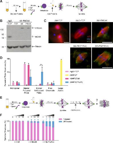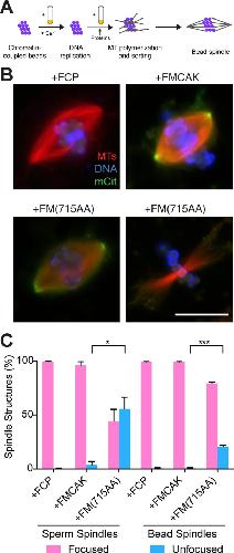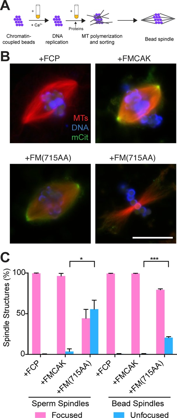FIGURE 4:. FM(715AA) can generate unfocused poles in chromatin-bead spindles. (A) Xenopus egg extracts containing chromatin-coupled beads were cycled into interphase, supplemented with 100 nM FCP, FMCAK, or FM(715AA), and cycled back into mitosis, and then spindles were assembled. (B) Representative images of spindles in FCP, FMCAK, and FM(715AA) reactions. Images were scaled equivalently except for the MTs in the unfocused spindle in FM(715AA) reactions, in which the MT channel was enhanced to visualize the structure. Scale bar, 20 μm. (C) Quantification of the percentage of spindle structures that are categorized with focused or unfocused spindle poles. Data represent mean ± SD (n = 3; 100 structures counted per experiment). *p < 0.05, ***p < 0.001.