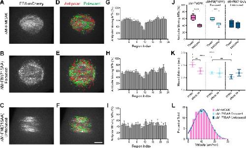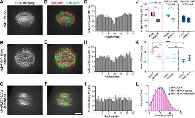 FIGURE 5:. FM(715AA) inhibits MT growth from the poles and shortens the lifetime of growing MTs. (A–C) Single-frame confocal images of 0.3 μM EB1-mCherry in a control ΔM+FMCAK spindle, a focused ΔM+FM(715AA) spindle, and an unfocused ΔM+FM(715AA) spindle. Scale bar, 10 μm. (D–F) EB1 comets from time-lapse sequence of spindles in A–C were identified and tracked using plusTipTracker. Tracks were color coded to reflect the direction of growth, in which red indicates antipolar movement and green indicates poleward movement. Tracks were overlaid onto the single-frame image on the left. (G–I) Spindles were divided into 23 regions, and the distributions of tracks were plotted as mean ± SEM of the percentage of antipolar-moving MTs corresponding to the regions in D (7 spindles, 4972 tracks), E (6 spindles, 3696 tracks), and F (6 spindles, 2514 tracks). (J) The average percentage of antipolar-moving EB1 tracks in the two pole regions was calculated and compared with that at the spindle midzone. (K) Lifetimes of EB1 tracks in pole and midzone regions were measured and fitted with a one-phase exponential decay to determine the rate constant K (sec−1), and the average lifetime (τ) of the EB1 comets was determined from K−1. The average lifetime is plotted as mean ± 95% CI. (L) Histogram and Gaussian fit of EB1 track velocities detected in ΔM+FMCAK spindles or ΔM+FM(715AA) spindles with focused or unfocused poles. For details, see Supplemental Figure S5. **p < 0.01, ***p < 0.001, ****p < 0.0001.