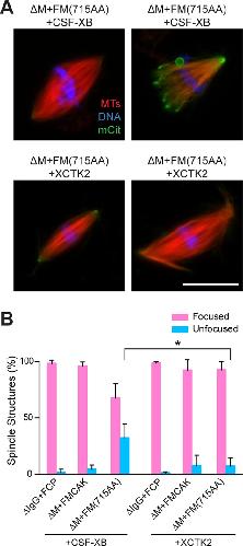 FIGURE 6:. XCTK2 addition rescues the unfocused-pole phenotype in spindles reconstituted with FM(715AA). (A) Representative images of spindles in MCAK-depleted Xenopus egg extracts that were reconstituted with 100 nM FCP, FMCAK, or FM(715AA) together with a fivefold excess of XCTK2 (100 nM) or equal volume of control buffer (CSF-XB). Scale bar, 20 μm. (B) Quantification of the percentage of spindle structures categorized as focused or unfocused spindles. Data represent mean ± SD (n = 3; 100 structures counted per experiment). *p < 0.05.