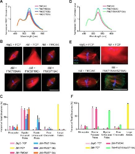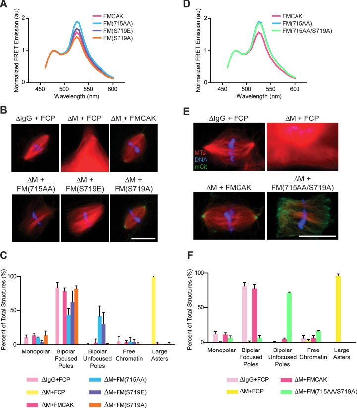 FIGURE 7:. FM(715AA) induces the unfocused-pole phenotype due to its altered conformation. (A) The phosphomimetic S719E and dephospho S719A mutations were made in FMCAK and their conformation measured using FRET by exciting mCerulean at 433 nm and measuring the emission from 460 to 600 nm. Data represent the mean of at least three experiments. (B) Representative images of spindles assembled in MCAK-depleted extracts that were reconstituted with 100 nM FCP, FMCAK, FM(715AA), FM(S719E), or FM(S719A). Scale bar, 20 μm. (C) Quantification of the MT structures in B. Data represent mean ± SD of three separate extracts in which 100 structures were counted per condition. (D) FRET emission of FM(715AA/S719A) compared with FMCAK and FM(715AA). Note that both curves nearly overlap. (E) Representative images of spindles reconstituted with 100 nM FCP, FMCAK, or FM(715AA/S719A). Scale bar, 20 μm. (F) Quantification of the MT structures in E. Data represent mean ± SD of three separate extracts in which 100 structures were counted per condition.