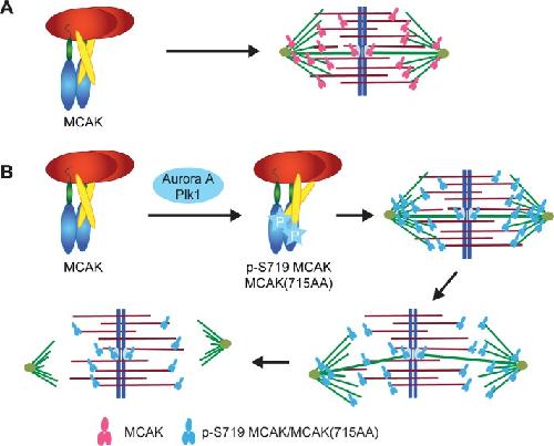 FIGURE 8:. Model for how the MCAK conformation alters subspindle targeting and generates spindles with unfocused poles. (A) MCAK displays a closed conformation in solution and is localized to kinetochores, spindle poles, and plus tips of MTs. (B) MCAK conformation is modulated through phosphorylation at S719 by either Aurora A or Plk1 kinase. E715A/E716A mutation in the far C-terminus of MCAK mimics this conformational change, resulting in a more “closed” conformation that brings the CT closer to the NT. This altered conformation of MCAK causes increased localization at the polar regions, which shortens MTs and reduces MT growth from the poles. Reducing MT length and number at the pole disrupts the polar array or may decouple the MT polar array from the barrel array, leading to spindles with unfocused poles.