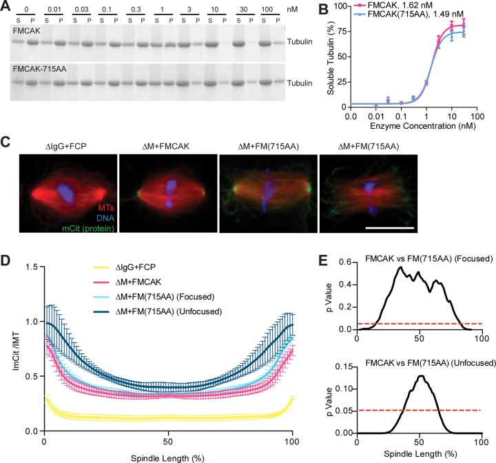 FIGURE 3:. FM(715AA) shows no difference in MT depolymerization activity but has increased targeting to spindle poles. (A) The 715AA mutation does not significantly affect the ability of MCAK to depolymerize MTs in vitro. From 0 to 100 nM FMCAK or FM(715AA) was incubated with GMPCPP-stabilized MTs and then sedimented by centrifugation. Equivalent amounts of the soluble (S) and pellet (P) fractions were run on 10% SDS–PAGE gels, stained with Coomassie, and quantified by densitometry. (B) Quantification of EC50 from four independent experiments. Mean ± SEM for each enzyme concentration is graphed with the best-fit four-parameter nonlinear regression curve determined in Prism. (C) Representative images of spindles from MCAK-depleted and FCP, FMCAK, and FM(715AA) add-back reactions. Scale bar, 20 μm. (D) The ratio of the intensity of the localized protein (ImCit) relative to the MT intensity (IMT) calculated and plotted as a function of the normalized spindle length. Data represent mean ± SD from three separate extracts in which 10–20 spindle structures were analyzed per condition. (E) Student’s t test analysis of the protein-to-MT intensity ratio (ImCit/IMT) across the spindle of FMCAK vs. FM(715AA). Red dashed line indicates p = 0.05.