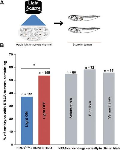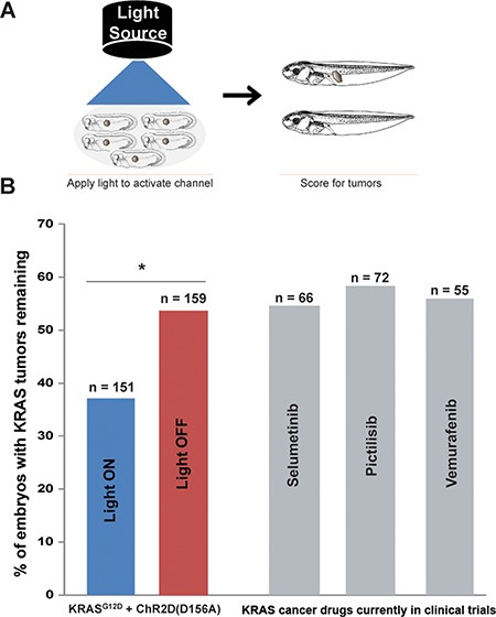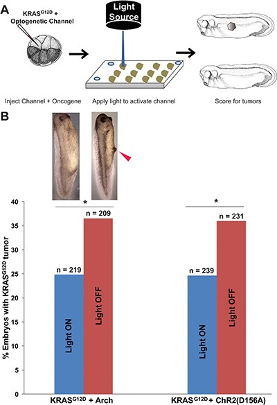 It has long been known that the resting potential of tumor cells is depolarized relative to their normal counterparts. More recent work has provided evidence that resting potential is not just a readout of cell state: it regulates cell behavior as well. Thus, the ability to control resting potential in vivo would provide a powerful new tool for the study and treatment of tumors, a tool capable of revealing living-state physiological information impossible to obtain using molecular tools applied to isolated cell components. Here we describe the first use of optogenetics to manipulate ion-flux mediated regulation of membrane potential specifically to prevent and cause regression of oncogene-induced tumors. Injection of mutant-KRAS mRNA induces tumor-like structures with many documented similarities to tumors, in Xenopus tadpoles. We show that expression and activation of either ChR2D156A, a blue-light activated cation channel, or Arch, a green-light activated proton pump, both of which hyperpolarize cells, significantly lowers the incidence of KRAS tumor formation. Excitingly, we also demonstrate that activation of co-expressed light-activated ion translocators after tumor formation significantly increases the frequency with which the tumors regress in a process called normalization. These data demonstrate an optogenetic approach to dissect the biophysics of cancer. Moreover, they provide proof-of-principle for a novel class of interventions, directed at regulating cell state by targeting physiological regulators that can over-ride the presence of mutations.