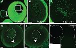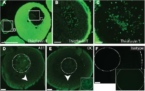 Fig. 1. Xenopus oocytes contain nuclear and spatially localized cytosolic amyloid particles. Sectioned ovary was probed for amyloids using thioflavin T (thio-T) or antibodies that recognize either oligomeric (A11) or fibrillar (OC) amyloid epitopes. (A-C) Thio-T staining in (A) highlights the difference in amyloid-positive yolk deposition as oocytes develop from stage II on (left) to stage VI (right). B and C show enlargements of the stage II (B) and stage VI (C) oocyte nuclear thio-T staining in A. Scale bars: (A) 500 µm and (B-C) 50 µm. (D,E) Antibody detection of amyloids in stage III oocytes using either an A11 (D) or OC (E) antibody reveals nuclear (dotted circles) and cytosolic staining of particles similar to that found in A-C, but with lower reactivity to yolk platelets. Arrowheads in D and E indicate increased staining in vegetal hemisphere of oocytes. (F) An isotype control antibody-stained sample. Insets in E and F depict increased exposure times to better visualize nuclear staining. Scale bars: 100 µm.