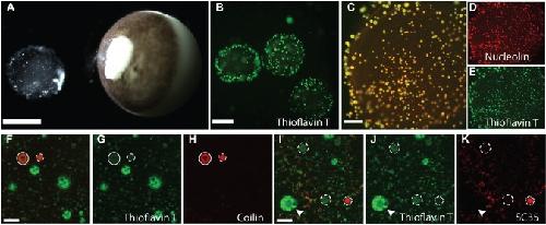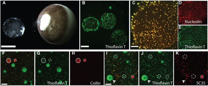 Fig. 2. Isolated Xenopus nuclei (GVs) can be used for combinatorial identification of nuclear particles with thioflavin T and particle specific antibodies. (A) Manual removal of a GV from a stage VI oocyte. Scale bar: 500 µm. (B) Isolated GVs demonstrate amyloid containing particles seconds after thio-T staining. Scale bar: 200 µm. (C) Overlay of nucleolin immunofluorescence (red, D) and thio-T (green, E) staining of an isolated GV. Scale bar: 100 µm. (F) Overlay of images (G, green) stained with thio-T and (H, red) coilin immunofluorescence. A pearl particle is circled with a solid line, a histone locus body circled with a dashed line. Scale bar: 5 µm. (I) Overlay of panels (J, green) stained with thio-T and (K, red) SC35 immunofluorescence. Dashed lines indicate some thio-T-positive SC35-negative particles, dotted lines indicate a thio-T- and SC35-positive particle. The arrowhead points to a nucleolus in I-K. Scale bars: 5 µm.