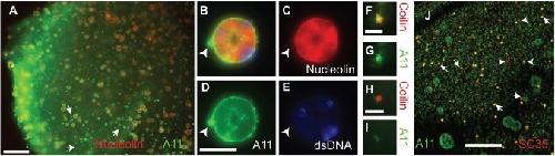 Fig. 3. Nuclear particles in isolated Xenopus nuclei (GVs) have overlapping but distinctive reactivity to amyloid detecting antibodies and thio-T. Isolated GVs were examined using an anti-oligomeric amyloid antibody A11 and particle identifying antibodies. Panel (A) shows a low magnification view of a GV using A11 (green) and anti-nucleolin (red) antibodies. Arrows point to some of the many nucleolin negative, A11 positive particles. (B-E) are higher magnification images of a single nucleolus with (B) representing the composite of (C) anti-nucleolin (red), (D) A11 antibody (green) and (E) anti-dsDNA (blue) staining. The arrowhead points to an A11 positive sub structure. Scale bars (A) 500µm and (B-E) 10µm. Coilin positive particles, histone locus bodies (F-G) and pearls (H-I) are shown as overlays of coilin (red) and A11 (green) in (F and H). The A11 signal of the histone locus body (G) is higher than that of the pearl (I). Scale bars: 5µm. The composite image of A11 and anti-SC35 used to detect speckles in (J) highlights the variable intensity of the A11 signals. In (J) speckles with low A11 signal are indicated with arrowheads and those with more robust A11 signal with arrows. Scale bar: 50μm.