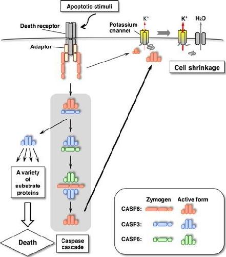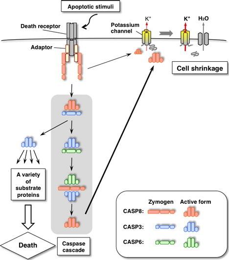 Dysregulation of a potassium channel, THIK-1, targeted by caspase-8 accelerates cell shrinkage.