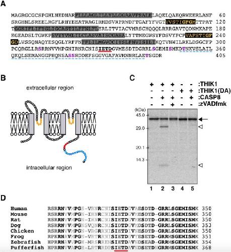 Fig. 1. Characterization of the THIK-1 molecule. (A) The amino acid sequence of mouse THIK-1. The putative pore-forming segment containing the GFG signature sequence and the transmembrane region are indicated by the black and shaded boxes, respectively. The CASP8 recognition sequence, IETD, and the HAMP-like domain are underscored with a bold line and a dotted line, respectively. Putative intracellular phosphorylation sites are indicated in violet based on the previous study [20]. (B) Predicted topology of THIK-1. THIK-1 is a member of the two-pore domain potassium channel (K2P) family and contains four transmembrane segments and two-pore-forming domains. The pore-forming segment, the IETD sequence and the HAMP-like domain are indicated in orange, red, and blue, respectively. (C) In vitro cleavage assay of THIK-1 by active CASP8. The protease activity of active CASP8 against recombinant THIK-1 and its mutant was examined. Both recombinant THIK-1 and THIK1(DA) proteins, which were synthesized by in vitro translation as described in the Materials and methods section, were incubated with or without active CASP8 in the presence or absence of zVAD-fmk. After 1 h, the reaction mixture was resolved by SDS-PAGE and analyzed using an image analyzer. The sizes of molecular weight standards are shown at the left side. The arrow indicates full-length THIK-1 and THIK1(DA) and white arrowheads identify the cleaved peptide fragments. (D) Multiple alignment of the amino acid sequences for the region containing the IETD sequence from several vertebrate species. Amino acids that are identical or similar in all animals are indicated in bold black or bold dark gray, respectively. |