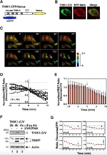 Fig. 4. Monitoring of the structural alterations of THIK-1 during apoptosis. (A) A schematic diagram of the constructs. THIK1-CFP/Venus is a variant with seCFP inserted into the N-terminal cytoplasmic region of THIK1-Venus. (B) Cellular localization of THIK1-CFP/Venus. The fluorescent images of HeLa cells expressing both THIK1-CFP/Venus and RFP-Mem proteins were captured through green and red fluorescence channels using a confocal microscope, and representative and merged images are displayed. Scale bar indicates 10 μm. (C) The structural alteration of THIK-1 during apoptosis was monitored by cytological analysis. A series of fluorescence emission ratio images (Venus/seCFP) of dying cells are displayed in intensity-modulated display mode, where warmer hues indicate a higher Venus/seCFP ratio or higher FRET efficiency, and brightness indicates the intensity of the Venus channel. Numbers in each panel indicate time after taking the first image. (D) The adjusted profiles of FRET ratios before and after cell shrinkage. Normalized FRET ratios were plotted over a time frame 10 min before and after cell shrinkage, based on time courses from single cells. Time zero indicates the moment when cell shrinkage began. N indicates the number of cells examined. (E) A summary of the FRET analysis. The bar graph indicates the means and standard deviations based on the data in (D). The arrow indicates the beginning of cell shrinkage. (F) Detection of the caspase-specific cleavage of THIK1-CFP/Venus. Cell extracts from HeLa cells expressing THIK1-CFP/Venus were prepared at the indicated times after Fas ligation. As a control, half of the transfectants were co-incubated with zVAD-fmk. The cleaved fragments were detected by immunoblotting with an anti-GFP antibody. PARP and actin were also examined by immunoblotting with suitable specific antibodies. Arrows indicate intact proteins while white arrowheads identify the cleaved fragments through all experiments. (G) The graphical representation of the FRET ratio of HeLa cells expressing THIK1-CFP/Venus during apoptosis. The time course runs 5 min before and after cell shrinkage. The temporal fluctuations of the Venus/seCFP ratio in four single cells are plotted in each panel. The arrow indicates the beginning of cell shrinkage, and the numbers in parentheses indicate the pixel size selected for detection. |