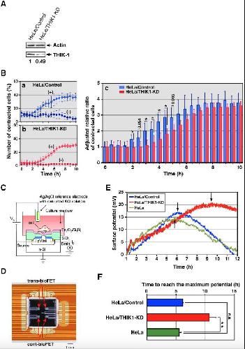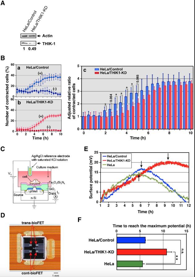 Fig. 5. Assessment of the direct involvement of THIK-1 in cell shrinkage and potassium leakage during apoptosis. (A) Immunoblot analysis of human THIK-1 proteins downregulated by RNA interference. Cell extracts from HeLa stable transfectants HeLa/Control and HeLa/THIK1-KD carrying either pSilencer or pSi-shTHIK1 were prepared and analyzed by SDS-PAGE, followed by immunoblotting with anti-human THIK-1 and anti-actin antibodies. The numbers indicate the ratio of endogenous THIK-1 between two stable lines after calculating the amounts of THIK-1 relative to actin using an image analyzer. (B) The effect of THIK-1 knockdown on cell shrinkage in apoptotic induction. Stable transfectants carrying plasmids, either pSilencer (panel a) or pSi-shTHIK1 (panel b), in combination with pCAGGS-EGFP/IRES-Neo, were automatically measured for morphological changes in the presence (+) or absence (â) of anti-Fas antibody. The extent of cell contraction is summarized in panel c. Data are representative of two independent experiments and presented as the means and standard deviations of samples counted from ten different fields in the plate. Statistical analysis was performed by Student's t-test. Asterisks show p < 0.05. (C) Conceptual structure of the biologically coupled field effect transistor (bioFET). Schematic illustration for measurement of the surface potential of the bioFET is shown. A shift of the threshold voltage VT can be determined from the gate voltage (VG)-drain current (ID) characteristics in a phosphate buffer solution [25 mM Na2HPO4 and 25 mM KH2PO4, (pH 6.86)]. (D) Photograph of the fabricated FET chip. Four N-channel depletion mode bioFETs were prepared in a 5 mm à 5 mm chip and mounted on a flexible polyimide film with patterned copper electrodes and wire-bonded. Measurements were performed by use of the two kinds of FETs: the trans-bioFET for stable transfectants and the cont-bioFET for parental HeLa cells. (E) Monitoring of the potassium leakage in dying cells using the bioFET. Stable transfectants HeLa/Control and HeLa/THIK1-KD carrying plasmids pSilencer (blue line) or pSi-shTHIK1 (red line) were placed in trans-bioFETs, and their surface potential changes were monitored during anti-Fas antibody treatment. Parental HeLa cells (moss-green line) placed in the cont-bioFET were also monitored with apoptotic stimulation. The electrical potentials were determined using a real-time semiconductor analyzer. Each arrow indicates a maximum point of the surface potential in transfectants and parental HeLa cells. The data are representative of three independent experiments. (F) A summary of the monitoring data related to the potassium leakage. Times to reach a maximum point of the surface potential in cell samples are indicated as the means and standard deviations from three independent experiments. Statistical validation was performed by Student's t-test. A double asterisk indicates p < 0.01 and n.s. is not significant. |