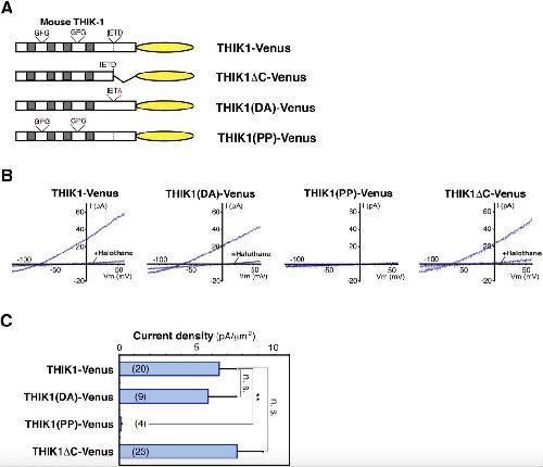Fig. 6. Physiological function analysis of THIK-1 as a potassium channel. (A) A schematic diagram of the constructs. THIK1 â C-Venus is a truncated form lacking the HAMP-like domain. THIK1(DA)-Venus and THIK1(PP)-Venus are the same as shown in Figs. 2A and 3D, respectively. Gray boxes indicate transmembrane regions. (B) Representative current recordings of THIK-1 and its mutants. The current-voltage (IV) relationships of transfectants expressing either THIK1-Venus, THIK1(DA)-Venus, THIK1(PP)-Venus, or THIK1 â C-Venus were measured from â 120 mV to 60 mV using the inside-out patch-clamp technique. In Cos-7 transfectants expressing either THIK1-Venus, THIK1(DA)-Venus, or THIK1 â C-Venus, the IV were also measured in the presence of 1.75 mM halothane. (C) A summary of the data in (B) is presented. Data measured at â 60 mV are indicated as means with standard error of the mean. Numbers in parentheses indicate the numbers of cells examined. Statistical validation was performed by Student's t-test. A double asterisk shows p < 0.01 and n.s. is not significant. |