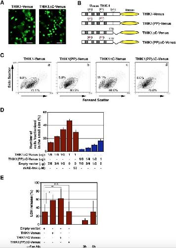 Fig. 7. Functional analyses of the truncated form of THIK-1. (A) Morphological analysis of HeLa cells transiently expressing either THIK1-Venus or THIK1 â C-Venus. Two days after transfection, cells were photographed by fluorescence microscopy. Scale bar indicates 100 μm. (B) A schematic diagram of the constructs. THIK1(PP)âC-Venus is a mutant possessing the characteristics of both THIK1 â C-Venus and THIK1(PP)-Venus. Gray boxes indicate transmembrane regions. (C) Assessment of the cell volume of transfectants by flow cytometric analysis. To evaluate the cellular size of transfectants expressing either THIK1-Venus, THIK1(PP)-Venus, THIK1 â C-Venus, or THIK1(PP)âC-Venus, Venus-positive cells gated in Supplemental Fig. S4B were analyzed using a flow cytometer. Percentages indicate the populations detected in both small and normal-size fractions of the Venus-positive cells. Data are representative of three independent experiments. (D) The effect of the cytoplasmic region of THIK-1 on cell volume. Approximately 1 à 105 cells were seeded in a 12-well plate and transfected with 1.0 μg of plasmid DNAs. After removing floating cells on the following day, cells were further cultured in the presence or absence of 50 μM zVAD-fmk for 24 h. At 2 days post-transfection, the number of Venus-positive cells present in the small-volume fraction was counted by flow cytometry in each experiment. Data are presented as the means and standard deviations from three independent experiments. (E) LDH enzymatic assay. At 2 days post-transfection of plasmid DNAs, the LDH activity in both the culture medium and the cytosol of transfected cells was measured as described in the Materials and methods section. The LDH activity of cells subjected to apoptotic stimuli by Fas ligation was also measured at the indicated times. The vertical line indicates the percentage of LDH in the culture medium relative to total LDH. Data are presented as the means and standard deviations from three independent experiments. Statistical analysis was performed by Student's t-test. A single asterisk and a double asterisk indicate p < 0.05 and p < 0.01, respectively, and n.s. is not significant. |