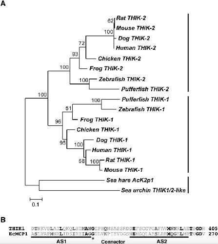 Fig. S1. Molecular phylogenetic analysis of THIK proteins. (A) Based on amino acid sequences cited from the NCBI and Ensembl databases, a molecular phylogenetic tree of THIK-1, THIK-2 and THIK1/2-like molecules of several animals was constructed by the maximum likelihood method based on an alignment generated with the T-Coffee program [1]. The number noted at branches indicates the percentage of each node that was supported in 100 bootstrap pseudo-replicates. The scale bar indicates an evolutionary distance of 0.1 amino acid substitutions per position. (B) The alignment of the THIK-1 HAMP-like domain and the HAMP domain of E. coli methyl-accepting chemotaxis protein I (MCP-I) (UniProtKB: P02942). Identical or similar amino acids are indicated in bold black or bold dark gray, respectively. Two amphipathic α-helices (AS1 and AS2) and a connector are shown under the amino acid sequence, based on a previous study [4]. The asterisk indicates a conserved Gly in all HAMP domains. |