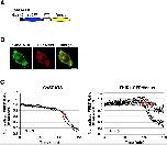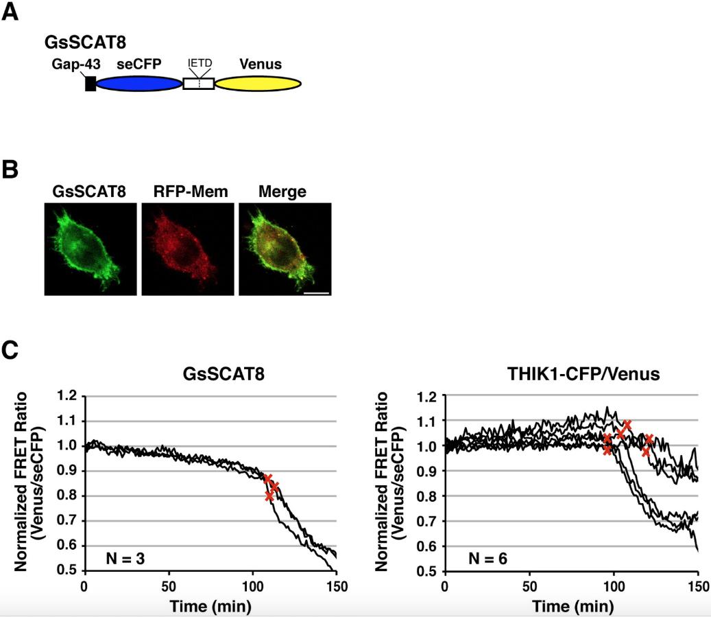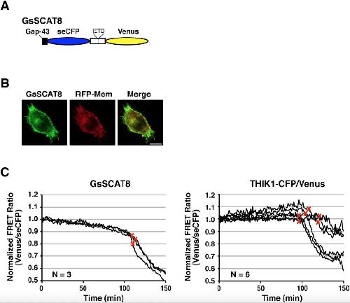 Fig. S2. Characterization of the THIK1-CFP/Venus fusion protein. (A) A schematic diagram of the construct. GsSCAT8 is a membrane-bound FRET-based biosensor for the detection of CASP8 activation [5]. GsSCAT8 contains the amino-terminal 20 amino acids of growth associated protein-43 (Gap-43) and the CASP8 recognition sequence, IETD in the hinge region. (B) Cellular localization of GsSCAT8. The fluorescent images of HeLa cells expressing GsSCAT8 and RFP-Mem were captured through green and red fluorescence channels using a confocal microscope, and representative and merged images are displayed. Scale bar indicates 10 μm. (C) Monitoring of the conformational dynamics of GsSCAT8 and THIK1-CFP/Venus by FRET. Transfected HeLa cells expressing either GsSCAT8 or THIK1-CFP/Venus were treated with 200 ng/ml anti-Fas antibody in the presence of 5 μg/ml CHX and FRET efficiency was monitored during apoptosis. The line in each graph indicates the emission ratio based on the fluorescence intensity of GsSCAT8 and THIK1-CFP/Venus detected through wavelength regions, 476-507 nm (for seCFP) and 515-615 nm (for Venus) in single cells. The normalization of the FRET ratio was carried out based on the initial value. Time zero indicates the moment when apoptotic stimulants are added. A red cross indicates the beginning of cell shrinkage. N indicates the number of cells examined. |