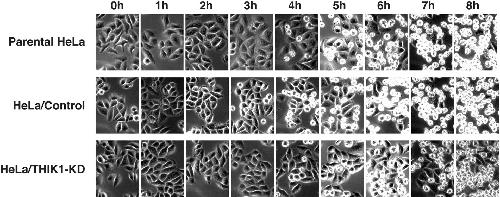 Fig. S3. Morphological observation of THIK-1-knockdown cells during apoptosis. After addition of anti-Fas antibody, parental HeLa cells and stable transfectants carrying plasmids, either pSilencer (Control) or pSi-shTHIK1 (THIK1-KD) were monitored for morphological changes every hour for a duration of 8 h. Representative microscopic images from the indicated time points are shown. |