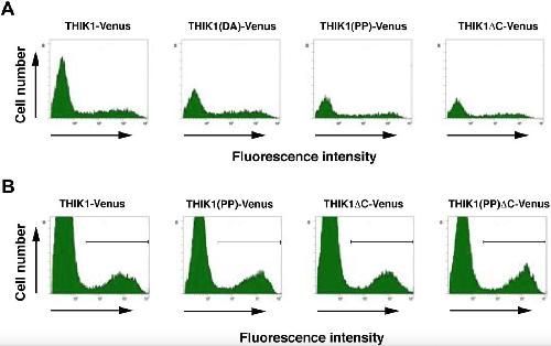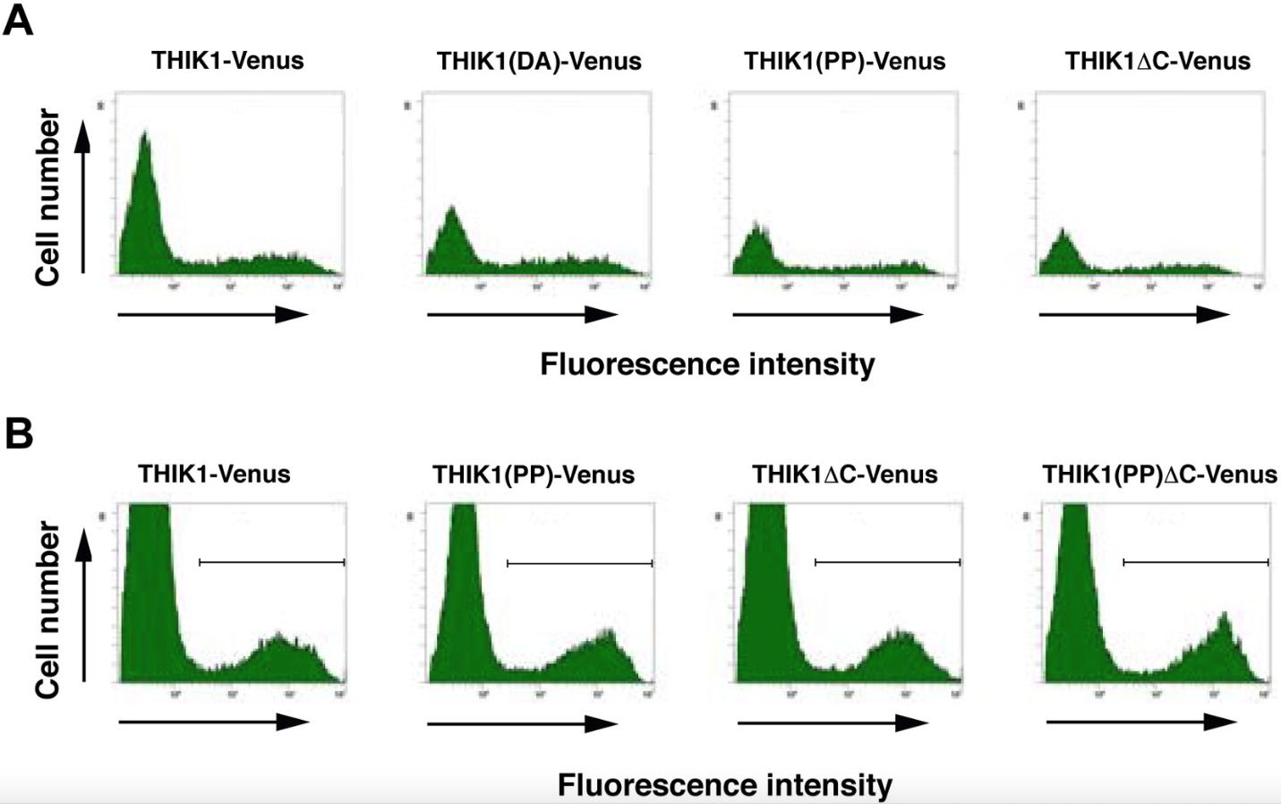 Fig. S4. Flow cytometric analyses of transfectants expressing either THIK-1 or its mutants. (A, B) Expression levels of THIK1-Venus, THIK1(DA)-Venus, THIK1(PP)-Venus, THIK1 â C-Venus, or THIK1(PP)âC-Venus in Cos-7 (A) and HeLa (B) transfectants were analyzed by a flow cytometer. Histograms show the fluorescence intensity of Venus in transfected cells. |