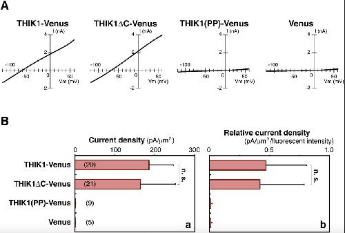 Fig. S5. Examination of K+ efflux through THIK-1, THIK1 â C, and THIK1(PP) with a cell-attached configuration. (A) Representative current recordings of THIK-1 and its mutants. The current-voltage (IV) relationships of Cos-7 transfectants expressing either Venus, THIK1-Venus, THIK1 â C-Venus, or THIK1(PP)-Venus were measured from â 120 mV to 60 mV using the whole-cell patch-clamp technique. (B) A summary of the data in (A) is presented. Both the data (panel a) and the compiled data based on the fluorescence intensity of Venus in cells (panel b) measured at â 0 mV are indicated as means with SEM, respectively. Numbers in parentheses indicate the numbers of cells examined. Statistical validation was performed by Student's t-test. n.s. is not significant. |
