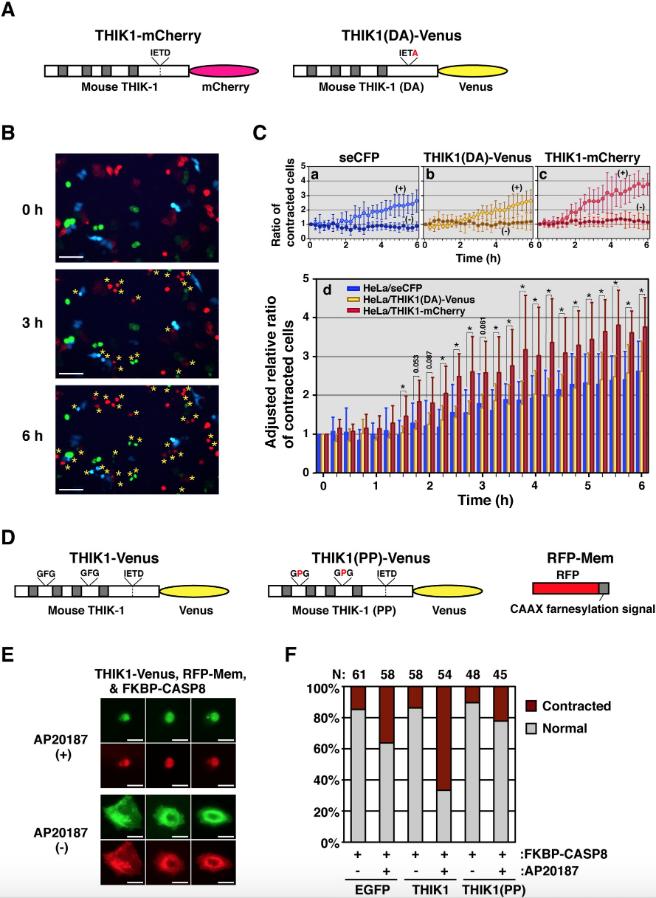 Fig. 3. Promotion of cell shrinkage in THIK-1-overexpressing cells. (A) A schematic diagram of the construct. THIK1-mCherry is a fusion protein consisting of mouse THIK-1 and a fluorescent protein, mCherry instead of Venus. Gray boxes indicate transmembrane regions. (B) Morphological analysis of HeLa cells expressing THIK1-mCherry, THIK1(DA)-Venus, or control seCFP during apoptosis. Fluorescence images of transfectants treated with an anti-Fas antibody were captured at indicated times using a cellular fluorescence image analyzer. Asterisks indicate contracted cells. Scale bar indicates 100 μm. (C) The effect of THIK-1 on cell shrinkage in apoptotic induction. HeLa cells expressing seCFP (panel a), THIK1(DA)-Venus (panel b), or THIK1-mCherry (panel c) in the same field were automatically examined with the instrument for morphological contraction in the presence (+) or absence (â) of anti-Fas antibody. The relative ratio of contracted cells detected by Fas-ligation to contracted cells without treatment is summarized in panel d. Data are representative of two independent experiments and presented as the means and standard deviations of samples counted from six different fields in the plate. Student's t-test was performed between seCFP- and THIK1-mCherry-expressing cells. Asterisks show p < 0.05. (D) A schematic diagram of the construct. THIK1(PP)-Venus is a channel-inactive THIK-1 mutant generated by exchanging both phenylalanine residues, which localize in the pore segment essential for the current of potassium ions, with prolines. Gray boxes indicate transmembrane regions. RFP-Mem, which consists of a RFP fused with the Ha-ras farnesylation CAAX sequence, localizes on the plasma membrane. (E) Morphological analysis of MCF-7 cells expressing THIK1-Venus together with both FKBP-CASP8 and RFP-Mem proteins after incubation with or without a dimerizer, AP20187. Both yellow and red fluorescence images of transfected cells were captured by fluorescence microscopy. Scale bar indicates 20 μm. (F) A summary of the morphological analysis. The numbers of both RFP- and Venus-positive cells displaying either a normal (gray) or a contracted (red) shape were counted under the microscope, and the corresponding percentages were calculated. N indicates the total number of transfected cells examined in three independent experiments. |