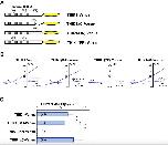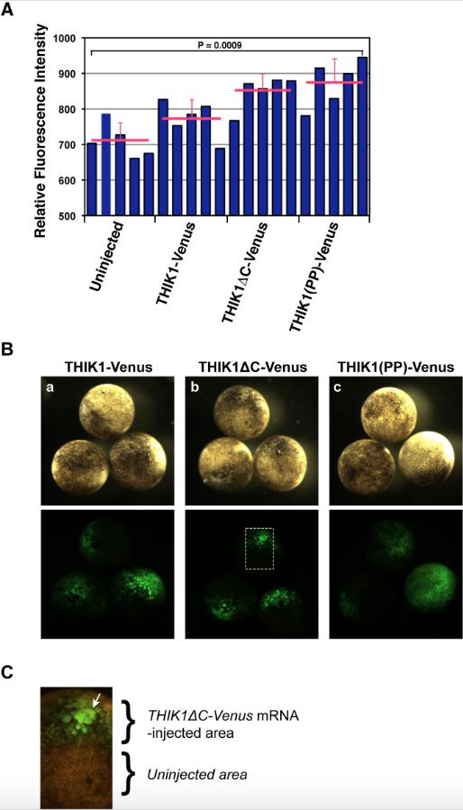 Fig. S6. Morphological analysis of Xenopus embryos expressing mouse THIK-1 and its mutants. (A) Measurements of the fluorescence intensity in embryo extracts. Microinjection into a single blastomere was performed at the two-cell stage either with 0.5 ng of THIK1-Venus, THIK1ÎC-Venus, or THIK1(PP)-Venus mRNA for 20 embryos each. Uninjected and injected embryos were then allowed to develop to stage 11 and extracts were prepared after subdividing into 5 subgroups with 4 embryos each. The relative fluorescence intensity of each sample was measured by a fluorescence plate reader. The means and standard deviations are shown in pink. The p-value was estimated by ANOVA among four groups. (B) Morphological observation of embryos subjected to mRNA microinjection. Embryos microinjected either with 2.5 ng of THIK1-Venus (panel a), THIK1ÎC-Venus (panel b), or THIK1(PP)-Venus (panel c) mRNA, were photographed at the stage 11 with both bright-field (upper panels) and fluorescent (lower panels) conditions. (C) A magnified view of the embryo injected with THIK1ÎC-Venus mRNA. The image magnifies the region identified by a white box in (B). The arrow indicates the irregular morphology of THIK1-positive cells. |