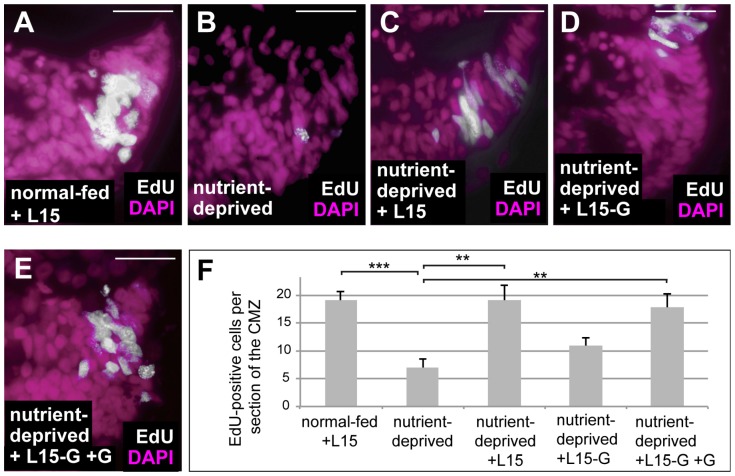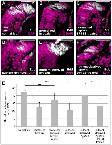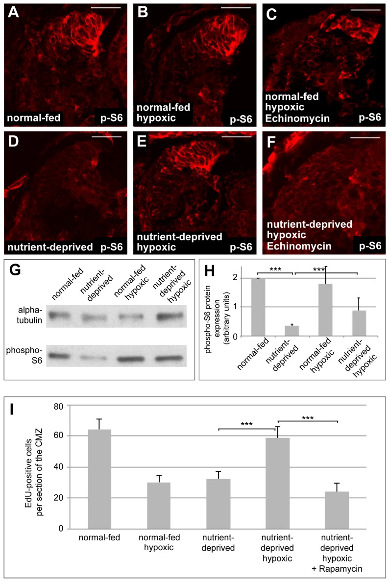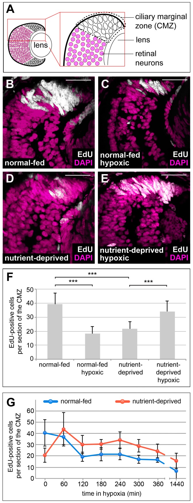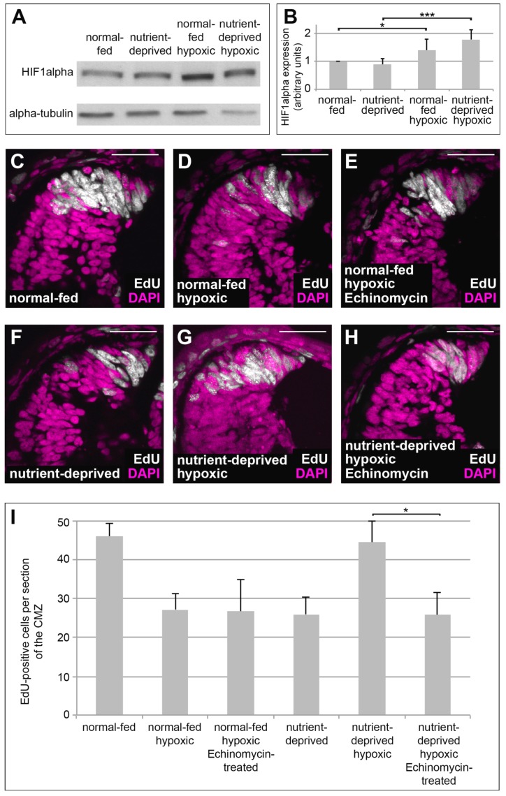 At a cellular level, nutrients are sensed by the mechanistic Target of Rapamycin (mTOR). The response of cells to hypoxia is regulated via action of the oxygen sensor Hypoxia-Inducible Factor 1 (HIF-1). During development, injury and disease, tissues might face conditions of both low nutrient supply and low oxygen, yet it is not clear how cells adapt to both nutrient restriction and hypoxia, or how mTOR and HIF-1 interact in such conditions. Here we explore this question in vivo with respect to cell proliferation using the ciliary marginal zone (CMZ) of Xenopus. We found that both nutrient-deprivation and hypoxia cause retinal progenitors to decrease their proliferation, yet when nutrient-deprived progenitors are exposed to hypoxia there is an unexpected rise in cell proliferation. This increase, mediated by HIF-1 signalling, is dependent on glutaminolysis and reactivation of the mTOR pathway. We discuss how these findings in non-transformed tissue may also shed light on the ability of cancer cells in poorly vascularised solid tumours to proliferate.