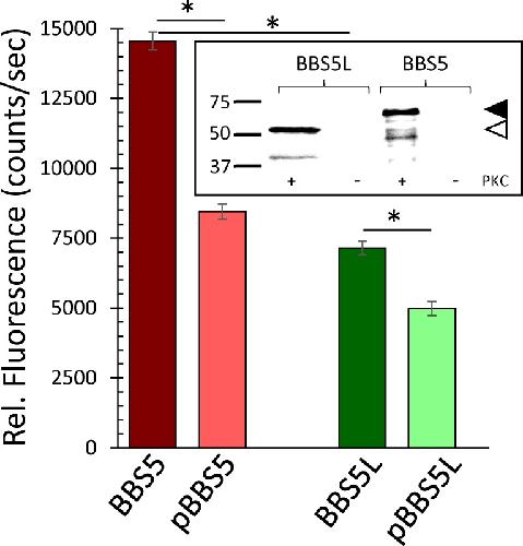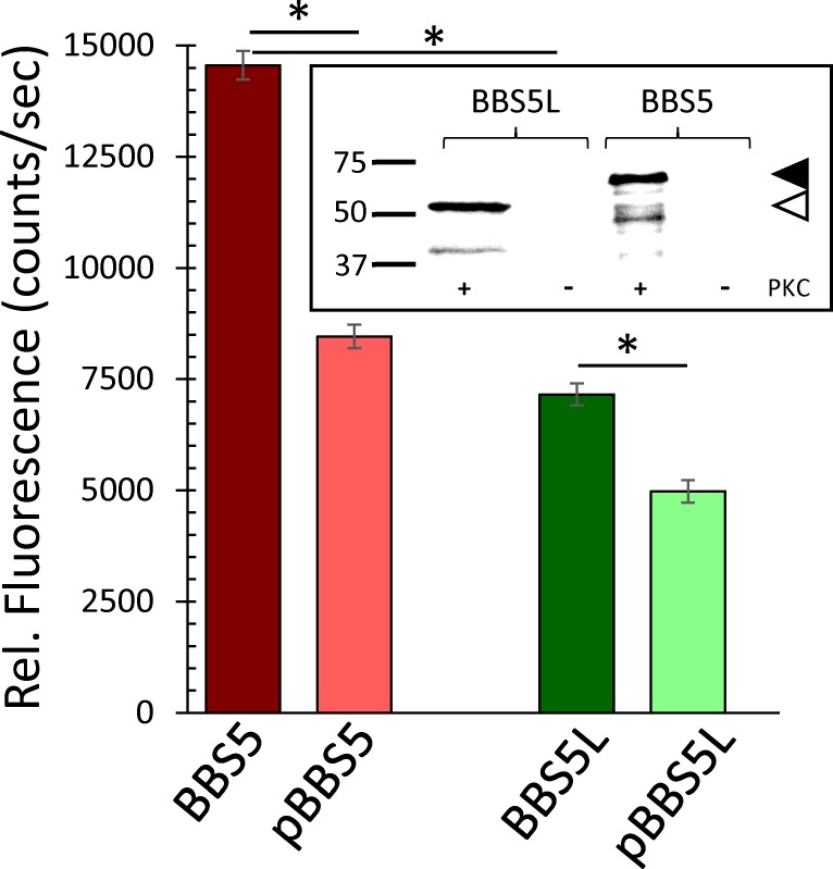 Fig 7. Binding of arrestin1 by BBS5L relative to BBS5, comparing unphosphorylated and phosphorylated conditions.ARR1-Alexa546 was co-immunoprecipitated with BBS5/GST or BBS5L/GST fusion protein with anti-GST antibody and precipitated arrestin1 measured fluorimetrically. ARR1-Alexa546 was pulled down by both BBS5L and BBS5, although the precipitation by BBS5L/GST was significantly less than by BBS5 (n = 6; ρ<0.05). Phosphorylation significantly reduced the pulldown of arrestin1 by both BBS5 and BBS5L (n = 6; ρ<0.05); error bars indicate SEM. Inset shows an immunoblot of the BBS5 and BBS5L proteins probed with anti-phosphoserine antibody after phosphorylation with (+) or without (-) PKC; arrowheads indicate the expected molecular mass for BBS5L-GST (open arrowhead) and BBS5-GST (black arrowhead).
