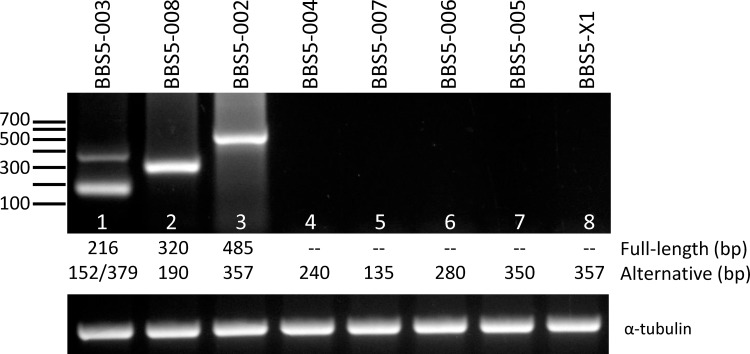 Fig 4. RT-PCR of predicted Bbs5 transcripts from retinal cDNA.The alternative transcripts for mouse Bbs5 predicted in the Ensembl (Bbs5-002 through -008) and MGI (Bbs5-X1) were amplified with primers that would selectively identify the alternative transcript. The predicted sizes (in bp) for each transcript are indicated below each lane for the full-length transcript and the alternative splice variant transcript [two alternative transcripts are possible in lane 1, corresponding to the deletion of Exon 8 (152 bp) or the inclusion of Exon 7A (379 bp)]. Lower panel shows amplification reactions with primers against alpha-tubulin to control for cDNA quality.