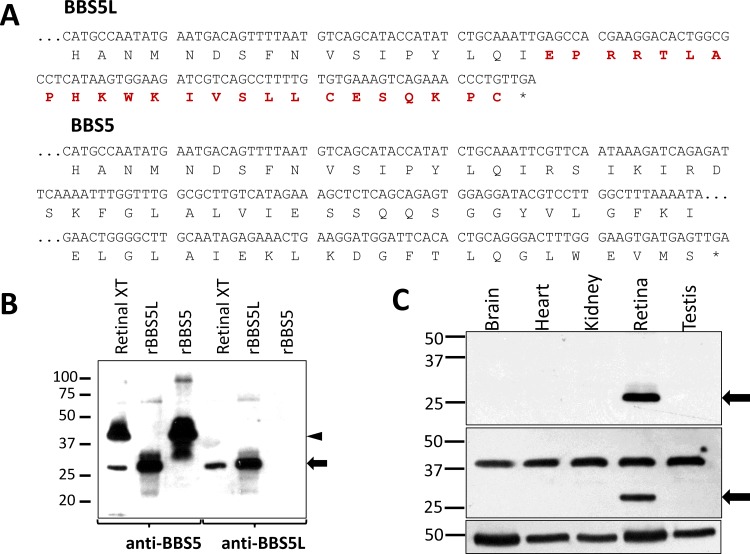 Fig 5. Characterization of a polyclonal antibody specific for BBS5L.(A) Conceptual translation of the alternative Bbs5 transcript (Bbs5L) in comparison with Bbs5 (the unique C-terminus is colored in red). (B) Immunoblots of murine retinal extracts and heterologously expressed BBS5L (rBBS5L) and BBS5 (rBBS5) were probed with either anti-BBS5#7–15 monoclonal antibody (left half) or with anti-BBS5L polyclonal serum (right half); arrowhead indicates BBS5 or rBBS5, arrow indicates BBS5L or rBBS5L. (C) Immunoblot of aqueous-soluble extracts prepared from the indicated mouse tissue probed with anti-BBS5L polyclonal serum identifies anti-BBS5L immunoreactivity only in the retinal extract (upper panel; arrow); an antibody that recognizes both the BBS5 and BBS5L reacts with BBS5 in all extracts, and BBS5L only in retinal extract (middle panel); inset below the blot shows a replicate blot of the tissue extracts probed with anti-beta-tubulin as a loading control.