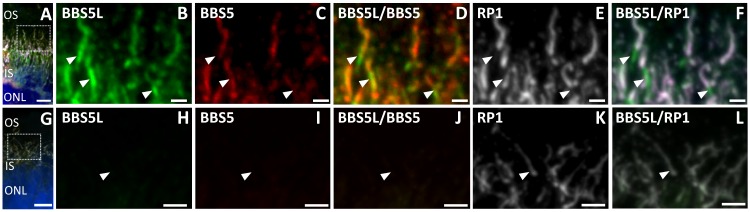 Fig 6. BBS5L localizes to the axonemal structure of the photoreceptors.(A) Lower magnification view of indirect immunofluorescence of antibodies against BBS5L (green), BBS5 (red), RP1 (white), and DAPI (blue) on cryofixed mouse retinal tissue (see methods for specific details on antibodies). (B-E) Enlargement of region indicated in (A) showing localization of BBS5L (B) and BBS5 (C). BBS5L and BBS5 reactivity are highly overlapping as seen in the merge (D). Staining with the axonemal marker RP1 (E) shows that BBS5L co-localizes with RP1 in the distal axoneme (F), but also stains the proximal transition zone of the axoneme where RP1 is absent (white arrowheads). G-L shows parallel staining with pre-absorption controls, using anti-BBS5L antiserum preabsorbed against BBS5L protein (H) or anti-BBS5 antibody preabsorbed against BBS5 protein (I). OS, outer segments, IS, inner segments, ONL, outer nuclear layer; scale bars are 10 μm (A) and 2.5 μm (B-F).