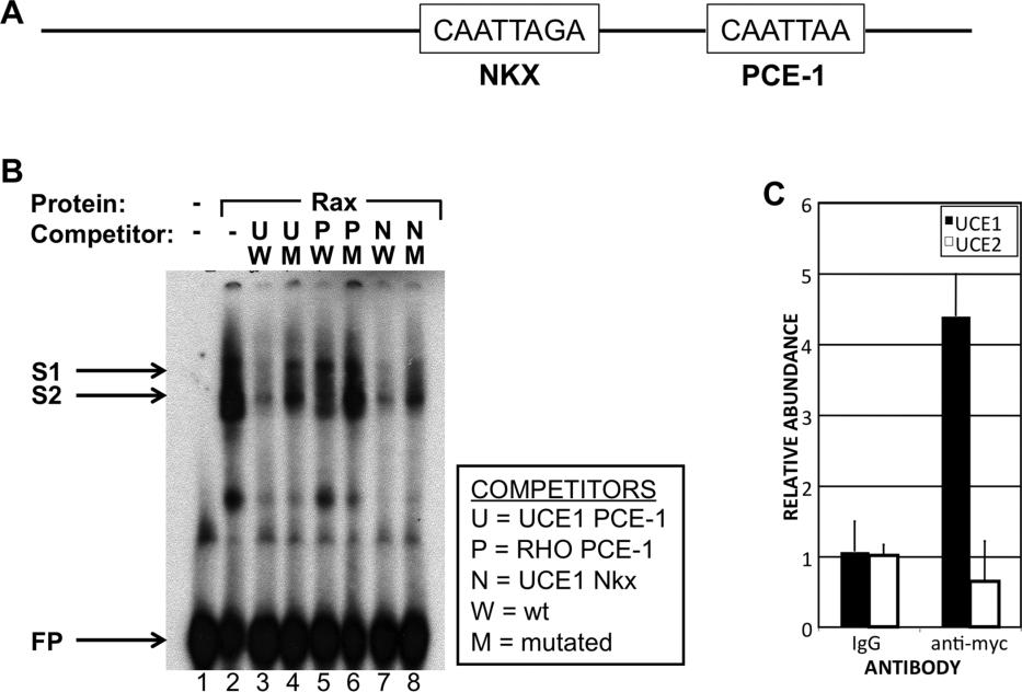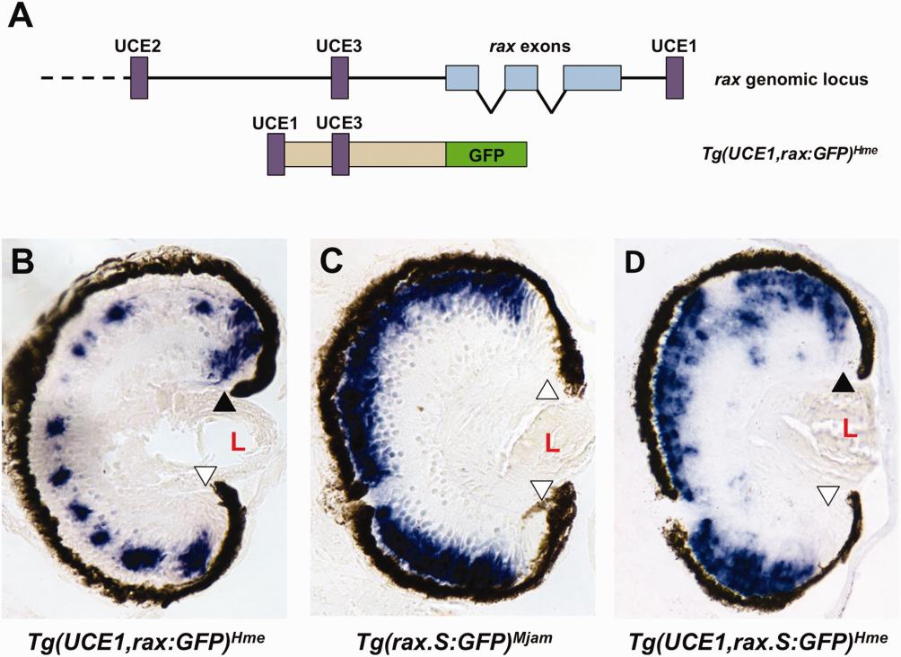 The Retinal homeobox (rax) gene is expressed in vertebrate retinal progenitor and stem cells and is essential for retinal development. In frogs, rax is expressed in the ciliary marginal zone (CMZ), a region containing retinal progenitor and stem cells at the anterior of the eye. Little is known regarding regulation of rax transcription and regulation of transcription of rax targets. We found that three ultra-conserved genomic elements (UCEs) flanking the rax coding region regulate expression of a rax promoter-GFP transgene in Xenopus tadpoles. One of these elements, UCE1, regulates expression of the transgene in the dorsal CMZ. UCE1 contains a Rax binding site, PCE-1. We demonstrate that rax regulates expression of the transgene through the PCE-1 site found in UCE1. Therefore, rax transcription in the CMZ is controlled, in part, by autoregulatory mechanisms.