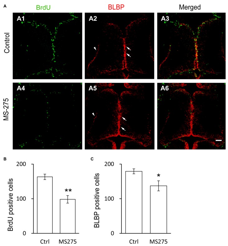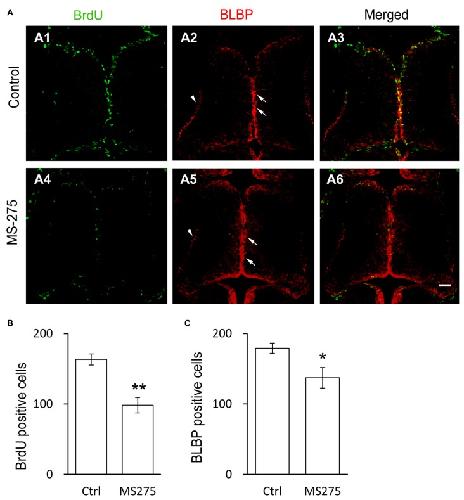 Figure 2. Class I HDAC inhibitor decreases the proliferative rate of radial glia cells. (A) Representative images showing the co-labeling for BrdU+ and BLBP+ in control (A1âA3) and MS-275-treated (10 μM, A4âA6) tecta. The BLBP+ cell bodies locate along the midline of the ventricular layer of the tectum (arrows) and the endfeet reside along the edge of neuropil (arrow heads). Scale: 50 μm. (BâC) Summary data showing that the numbers of BrdU+ and BLBP+ cells were dramatically decreased in MS-275-treated tecta compared to the control tecta. (BrdU: Ctrl, 163.2 ± 7.9, N = 5, MS-275, 98.2 ± 10.9, N = 4; BLBP: Ctrl, 179.2 ± 7.2, N = 5, MS-275, 137.2 ± 14.6, N = 4; *p < 0.05, **p < 0.01). |