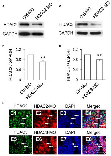 Figure 4. HDAC2 or HDAC3 expression is decreased by HDAC2-MO or HDAC3-MO knockdown. (A) Western blot analysis of homogenates from Ctrl-MO and HDAC2-MO transfected brains using an anti-HDAC2 antibody. (B) Quantification revealed that HDAC2 expression was significantly decreased in the HDAC2-MO transfected tectum compared to controls. (C) Ctrl-MO and HDAC3-MO transfected brain homogenates were compared using an anti-HDAC3 antibody. (D) HDAC3 expression was significantly decreased in the HDAC3-MO tectum. Data is represented as an intensity ratio of HDAC2 or HDAC3 to GAPDH normalized to the control value. Two-tailed T-test, N = 3, **p < 0.01. (E) Representative immunofluorescent staining of HDAC2 at HDAC2-MO-transfected cells (E1âE4) and HDAC3 at HDAC3-MO-transfected cells (E5âE8) in stage 48 tadpoles. Arrows indicate HDAC2/3-MO-transfected RGs stained for HDAC2/3. Scale: 20 μm. |