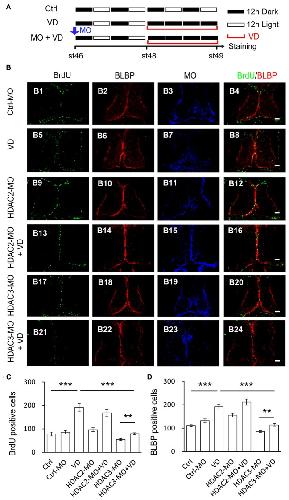 Figure 7. Visual deprivation-induced increase of proliferative cells is prevented by HDAC3 knockdown but not HDAC2 knockdown. (A) A cartoon showing that tadpoles at stage 46 were placed in a 12 h/12 h dark/light incubator for control, or a dark box for VD, or electroporated with HDAC2-MO/HDAC3-MO and placed in a dark box after 48 h for HDAC2-MO+VD/HDAC3-MO+VD. Tectal brains were labeled with BrdU at stage 49. (B) Representative fluorescent images showing BrdU- and BLBP-labeled cells in ctrl-MO (B1âB4), VD (B5âB8), HDAC2-MO (B9âB12), HDAC2-MO+VD (B13âB16), HDAC3-MO (B17âB20) and HDAC3-MO+VD (B21âB24) tadpoles. Scale: 50 μm. (CâD) Summary data showed that VD increased BrdU- and BLBP-labeled cells. HDAC3 but not HDAC2 knockdown partially blocked VD-induced increase of proliferative cells. (BrdU: Ctrl, 78.0 ± 8.3, N = 5, Ctrl-MO, 85.4 ± 7.1, N = 5, VD, 191.8 ± 16.4, N = 4, HDAC2-MO, 96.5 ± 8.5, N = 6, HDAC2-MO+VD, 168.2 ± 13.9, N = 4, HDAC3-MO, 54.2 ± 4.0, N = 4, HDAC3-MO+VD, 79.4 ± 4.1, N = 5; BLBP: Ctrl, 112.0 ± 5.6, N = 5, Ctrl-MO, 132.6 ± 9.7, N = 5, VD, 191.7 ± 9.9, N = 4, HDAC2-MO, 155.5 ± 7.8, N = 4, HDAC2-MO+VD, 211.5 ± 13.0, N = 5, HDAC3-MO, 86.0 ± 3.9, N = 4, HDAC3-MO+VD, 114.2 ± 6.0, N = 5; ***p < 0.001, **p < 0.01). |