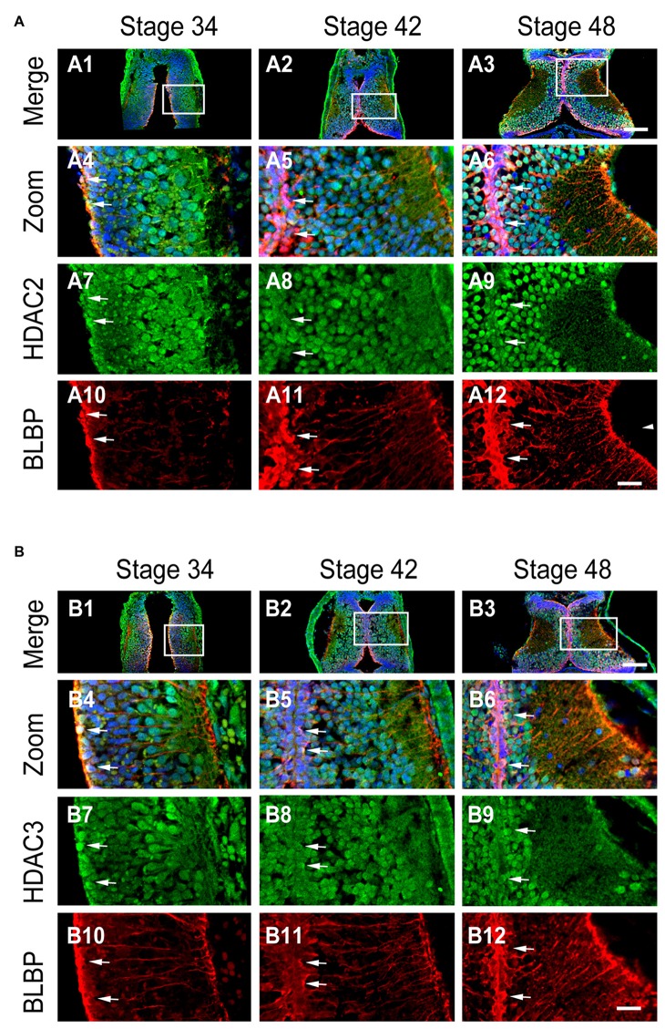 Figure 3. Developmental changes in HDAC2 or HDAC3 and colocalization with BLBP in the optic tectum. (A) Representative images showing the colocalization of HDAC2 and BLBP immunostaining at stages 34 (A1, zoom in: A4, A7, A10), 42 (A2, zoom in: A5, A8, A11), and 46 (A3, zoom in: A6, A9, A12) respectively. Arrow heads indicate the BLBP+ RGs processes. Arrows indicate BLBP+ RGs that are HDAC2+. Scale: 100 μm (zoom in: 20 μm). (B) Representative immunofluorescent images showing colocalization of HDAC3 and BLBP staining at stages 34 (B1, zoom in: B4, B7, B10), 42 (B2, zoom in: B5, B8, B11), and 48 (B3, zoom in: B6, B9, B12) respectively. Arrows indicate HDAC3 containing BLBP+ RGs. Scale: 100 μm (zoom in: 20 μm). |
