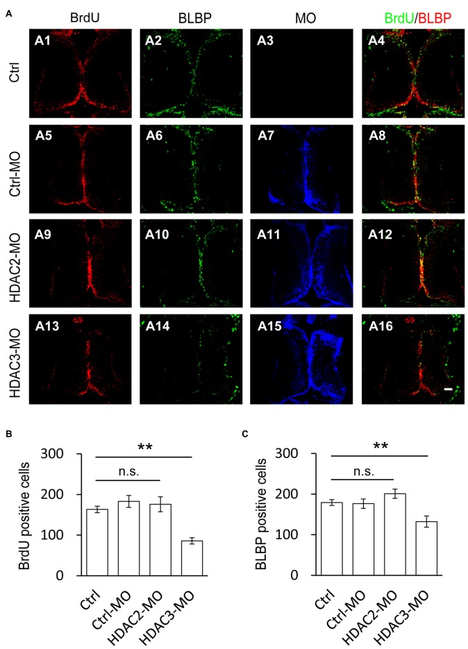 Figure 5. Number of BrdU+ cells is decreased by HDAC3 knockdown but not HDAC2 knockdown. (A) Representative immunofluorescence images of BrdU- and BLBP-labeled cells in control (A1âA4), Ctrl-MO (A5âA8), HDA2-MO (A9âA12) and HDAC3-MO (D13âD15) transfected brains in stage 48 tadpoles. Scale: 50 μm. (BâC) Summary data showing that HDAC3-MO, but not HDAC2-MO transfection dramatically decreased the number of BrdU- (B) and BLBP+ labeled cells (C). It was not significantly altered in Ctrl-MO tectum (B,C). (BrdU: Ctrl, 163.2 ± 7.9, N = 5, Ctrl-MO, 183.0 ± 14.6, N = 4, HDAC2-MO, 176.0 ± 18.6, N = 3, HDAC3-MO, 86.0 ± 7.8, N = 3; BLBP: Ctrl, 179.2 ± 7.2, N = 5, Ctrl-MO, 176.5 ± 11.5, N = 4, HDAC2-MO, 201.0 ± 11.4, N = 3, HDAC3-MO, 132.3 ± 13.8, N = 3; **p < 0.01). |