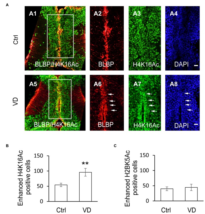 Figure 6. Visual experience induces selective increase of histone H4 acetylation at lysine 16. (A) Fluorescent images showing representative H4K16Ac+ cells in control (A1âA4), and VD (A5âA8) tadpoles. Scale: 50 μm. (B) Summary data revealed that visual deprivation increased the number of H4K16+ cells with enhanced fluorescence, which are colocalized with BLBP-labeled cells along the midline. (C) Summary data showing that VD barely changed the number of H2BK5+ cells with enhanced fluorescence. **p < 0.01. |
