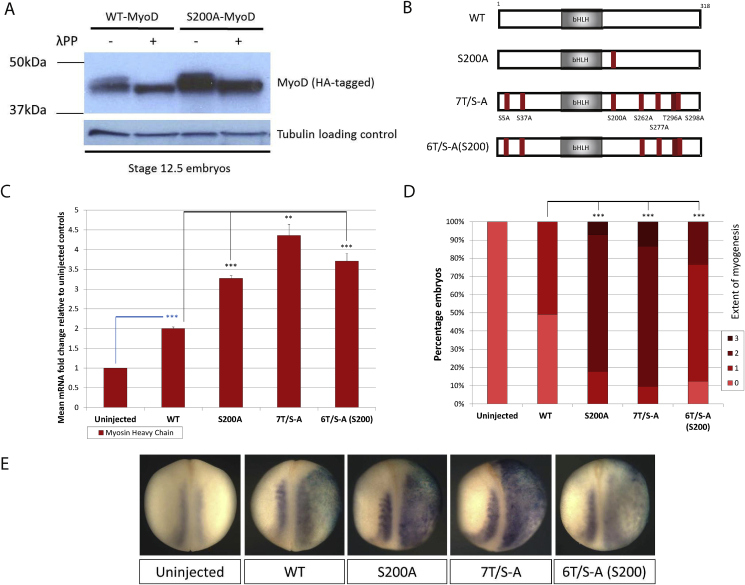 Fig. 1. MyoD is phospho-regulated on sites in addition to S200 during primary myogenesis. (A) Western blot analysis of protein extracts from stage 12.5 embryos injected with 200 pg mRNA encoding HA-tagged WT or S200A-MyoD. Samples were incubated with or without lambda protein phosphatase. Tubulin provided a loading control. (B) Schematic representation of WT mouse MyoD protein and phospho-mutant variants, showing approximate locations of SP/TP sites that are mutated to AP in each. (CâE) Embryos were unilaterally injected at the 2-cell stage with 100 pg mRNA encoding the respective MyoD constructs. At stage 18, embryos were assayed by RT-qPCR for Myosin Heavy Chain expression (C [n = 3]) or by ISH with semi-quantitative scoring for Muscle Actin expression (D [n = 52â73]) as described in the methods. Representative embryos are shown in (E); injected side to the right. * = (p < 0.05); ** = (p < 0.025); *** = (p < 0.0125).
