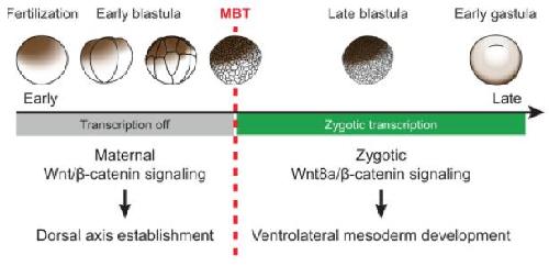 Dramatic shift in response to Wnt signaling in early Xenopus embryogenesis. Early Xenopus development is regulated by maternal gene products. Maternal Wnt signaling regulates dorsal axis establishment. After the MBT and the onset of zygotic transcription, Wnt signaling regulates essentially the opposite, ventral development or more precisely ventrolateral mesoderm development. Responses to maternal and to early zygotic Wnt signaling are mediated by essentially the same β-catenin-dependent signal transduction mechanism depicted in Figure 1