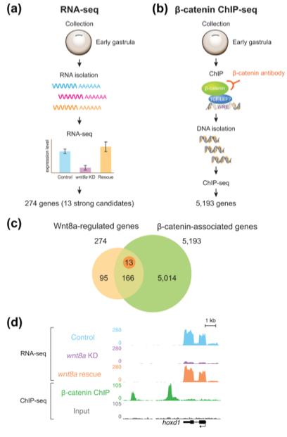 Identification of direct context-specific Wnt/β-catenin target genes in a genome-wide approach. (a) Transcriptome analysis (with RNA-seq) of early gastrula-stage embryos. Comparing the transcriptome of control embryos with embryos with wnt8a knockdown and those with experimentally reinstated Wnt8a identifies genes regulated by Wnt8a signaling in post-MBT embryos. (b) ChIP-seq analysis with a β-catenin-specific antibody identifies DNA-sequences associated with β-catenin and nearby potentially regulated genes in early gastrula-stage embryos. (c) Venn diagram comparing Wnt8a-regulated genes (in beige) from the RNA-seq analysis (see panel A) with the β-catenin associated genes (in green) from the ChIP-seq analysis (see panel B) with the overlap or intersection identifying direct Wnt8a target genes. Note that there are many more identified β-catenin associated genes than identified Wnt8a signaling-regulated genes in early gastrula embryos. (d) Example of a direct Wnt8a-target gene (hoxd1) in genome view, with from top to bottom, transcripts from control embryos, transcripts from the wnt8a knock down (note reduced expression), transcripts from embryos with experimentally reinstated Wnt8a expression, β-catenin-associated DNA sequences (âβ-cateninâ peaks), sequences of the control sample of the ChIP-seq experiment (Input control) and the hoxd1 gene model. Note β-catenin-associated DNA sequences downstream (left) of the rest of the hoxd1 gene and transcript sequences of particularly the exon sequences in the control and wnt8a rescue samples