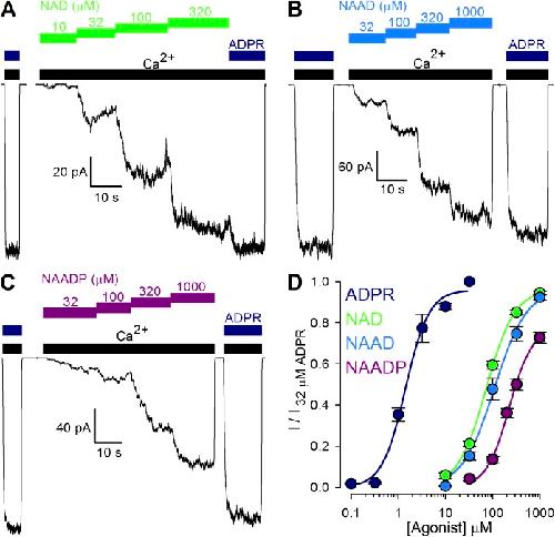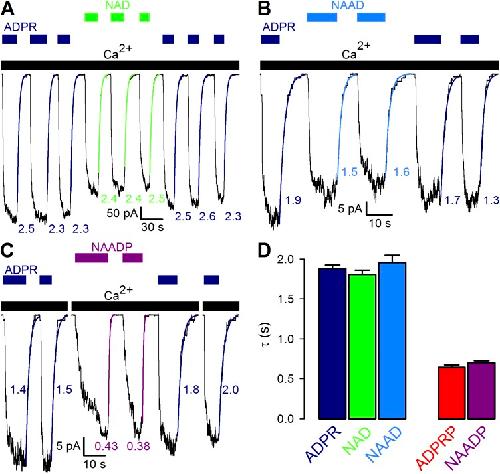Figure 6. Kinetic fingerprint betrays active contaminant of nonpurified pyridine dinucleotides. (A–C) Macroscopic T5L-TRPM2 current repeatedly activated by brief exposures to 32 µM ADPR (dark blue bars) or saturating concentrations of nonpurified NAD (1 mM; A, green bars), NAAD (1 mM; B, blue bars), or NAADP (2 mM; C, purple bars) in the continued presence of saturating Ca2+ (black bars). Current decay time courses upon nucleotide removal were fitted by single-exponential functions (colored curves), with time constants indicated (in seconds). (D) Average T5L-TRPM2 current relaxation time constants (in seconds) upon sudden removal of saturating NAD (green), NAAD (blue), or NAADP (purple) in the maintained presence of Ca2+. Analogous parameters for ADPR (dark blue) and ADPRP (red) are replotted from Fig. 5 D for comparison. Error bars represent mean ± SEM. |
