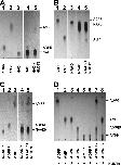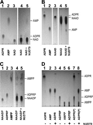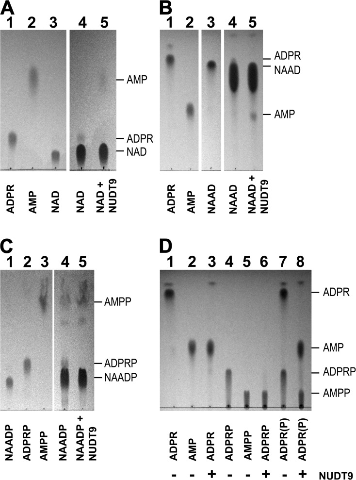 Figure 2. Enzymatic treatment efficiently removes ADPR and ADPRP contamination of pyridine dinucleotides. (A–C) TLC images showing the purification of (A) NAD, (B) NAAD, and (C) NAADP. Loaded samples (1 µl) were as follows: (A) 10 mM ADPR (lane 1), 10 mM AMP (lane 2), 10 mM NAD (lane 3), and 100 mM NAD before (lane 4) and after (lane 5) treatment with NUDT9. (B) 10 mM ADPR (lane 1), 10 mM AMP (lane 2), 10 mM NAAD (lane 3), and 100 mM NAAD before (lane 4) and after (lane 5) treatment with NUDT9. (C) 10 mM NAADP (lane 1), 10 mM ADPRP (lane 2), 10 mM AMPP (lane 3), and 100 mM NAADP before (lane 4) and after (lane 5) treatment with NUDT9. (D) Hydrolytic activity of NUDT9 on ADPR and ADPRP, showing 10 mM ADPR (lane 1), 10 mM AMP (lane 2), 10 mM ADPR treated with NUDT9 (lane 3), 10 mM ADPRP (lane 4), 10 mM AMPP (lane 5), 10 mM ADPRP treated with NUDT9 (lane 6), mixture of 10 mM ADPR and 10 mM ADPRP before (lane 7), and after (lane 8) treatment with NUDT9. Developing solution was DS2 in A and C, and DS1 in B and D. |