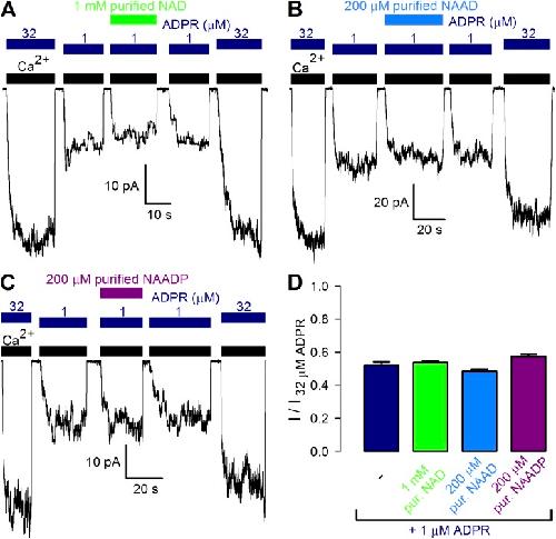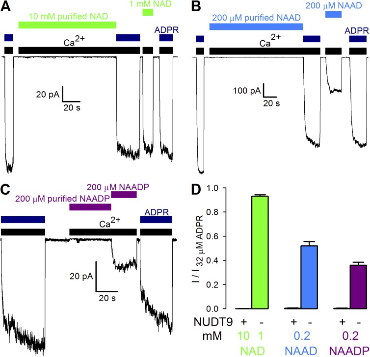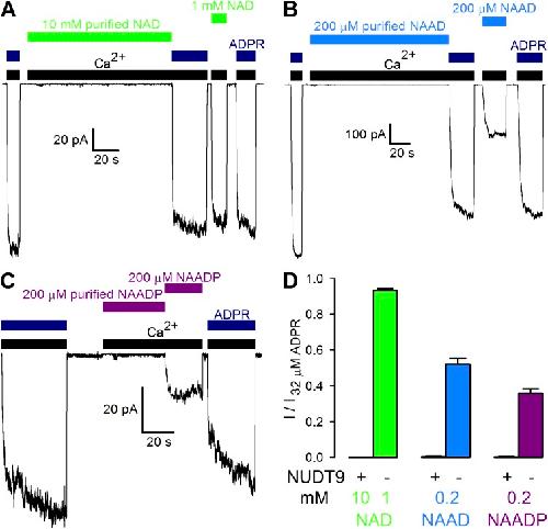 Figure 3. Purified pyridine dinucleotides do not activate TRPM2 channels even at very high concentrations. (A–C) Macroscopic T5L-TRPM2 currents evoked by cytosolic application of saturating Ca2+ (black bars) and either 32 µM ADPR (dark blue bars) or high concentrations of untreated or NUDT9-treated (“purified”) NAD (A, green bars), NAAD (B, blue bars), or NAADP (C, purple bars). (D) Fractional current activation by indicated concentrations (mM) of NUDT9-treated (“+”) or nonpurified (“−”) NAD (green), NAAD (blue), and NAADP (purple). Currents were normalized to those measured in 32 µM ADPR. Error bars represent mean ± SEM. |