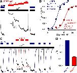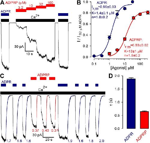 Figure 5. ADPRP is a novel true TRPM2 partial agonist with distinctive kinetic features. (A) Macroscopic T5L-TRPM2 currents in response to cytosolic application of saturating Ca2+ (black bars) and either 32 µM ADPR (dark blue bars) or increasing concentrations of ADPRP (red bars). (B) Dose–response curves for fractional current activation by ADPR (dark blue; replotted from Fig. 1 D) and ADPRP (red). Currents were normalized to those measured in 32 µM ADPR. Solid lines are fits to the Hill equation with parameters plotted in the panel. (C) Macroscopic T5L-TRPM2 current repeatedly activated by brief exposures to 32 µM ADPR (dark blue bars) or 100 µM ADPRP (red bars), in the continued presence of saturating Ca2+ (black bars). Current decay time courses upon nucleotide removal were fitted by single-exponential functions (colored curves) with time constants indicated (in seconds). (D) Average T5L-TRPM2 current relaxation time constants (in seconds) upon sudden removal of saturating ADPR (dark blue) or ADPRP (red) in the maintained presence of Ca2+. Error bars represent mean ± SEM. |