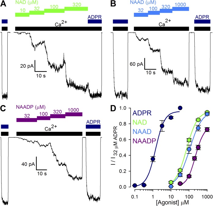 Figure 1. Nonpurified pyridine dinucleotides act as low affinity TRPM2 activators. (A–C) Macroscopic T5L-TRPM2 currents elicited in inside-out patches by cytosolic application of saturating (125 µM) Ca2+ (black bars) and either 32 µM ADPR (dark blue bars) or increasing concentrations of nonpurified NAD (A, green bars), NAAD (B, blue bars), or NAADP (C, purple bars). (D) Dose–response curves for fractional current activation by ADPR (dark blue; replotted from Tóth and Csanády, 2012), and nonpurified NAD (green), NAAD (blue), and NAADP (purple). Currents were normalized to those measured in 32 µM ADPR. Solid lines are fits to the Hill equation yielding K1/2 = 1.4 ± 0.1 µM, n = 1.8 ± 0.2, and Irel;∞ = 0.96 ± 0.03 for ADPR; K1/2 = 73 ± 3 µM, n = 1.4 ± 0.1, and Irel;∞ = 0.96 ± 0.01 for NAD; K1/2 = 109 ± 17 µM, n = 1.3 ± 0.2, and Irel;∞ = 0.96 ± 0.06 for NAAD; and K1/2 = 226 ± 19 µM, n = 1.8 ± 0.2, and Irel;∞ = 0.78 ± 0.04 for NAADP. Error bars represent mean ± SEM. |